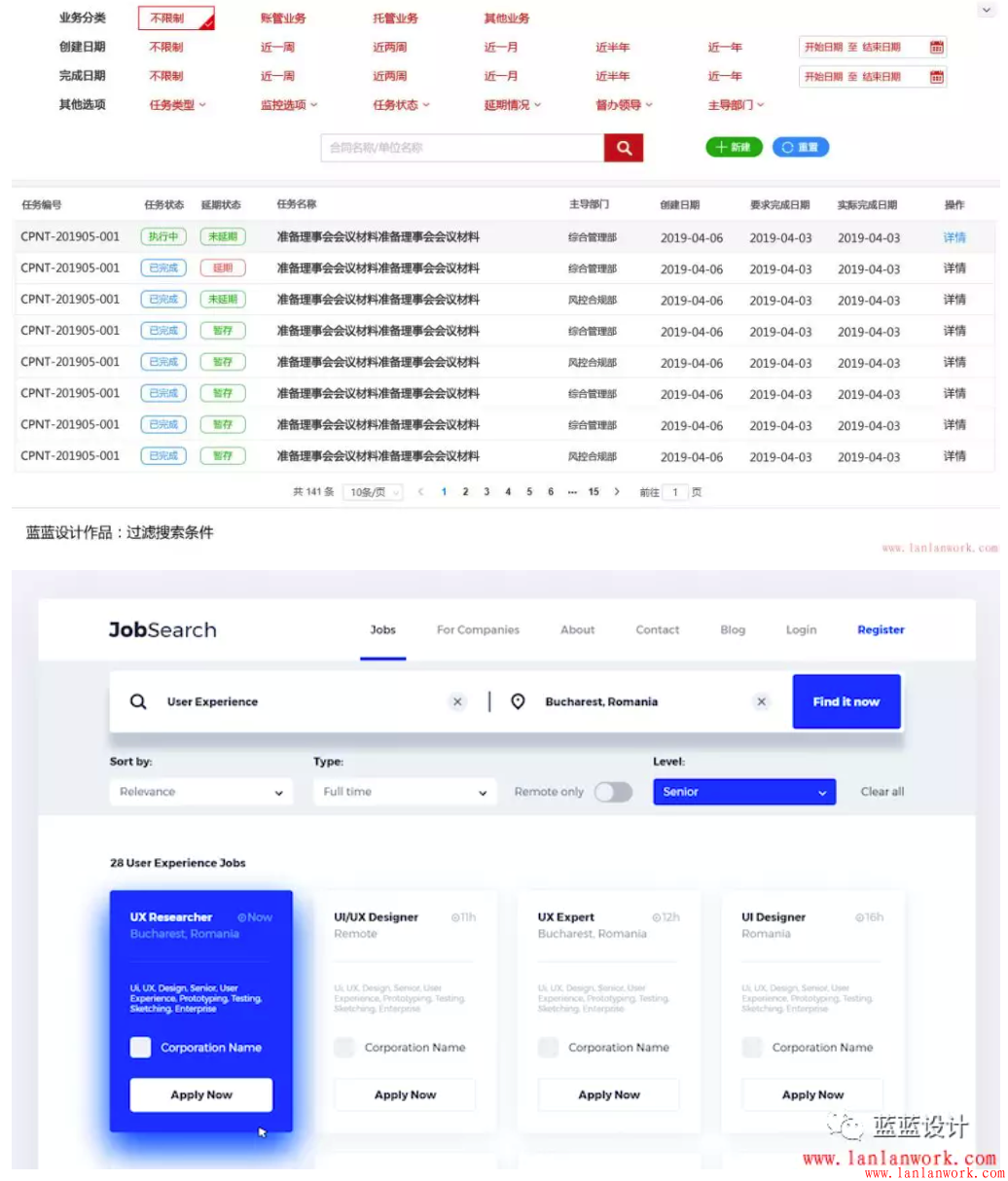 大多數(shù)表格的前面都有搜索過濾功能,如果搜索條件相當(dāng)多,可以精選一部分主要的排成一行,其他的隱藏,點(diǎn)箭頭再出現(xiàn)。整個(gè)搜索區(qū)域也可以有隱藏/顯示的按鈕,來給下面的表格更多的空間。