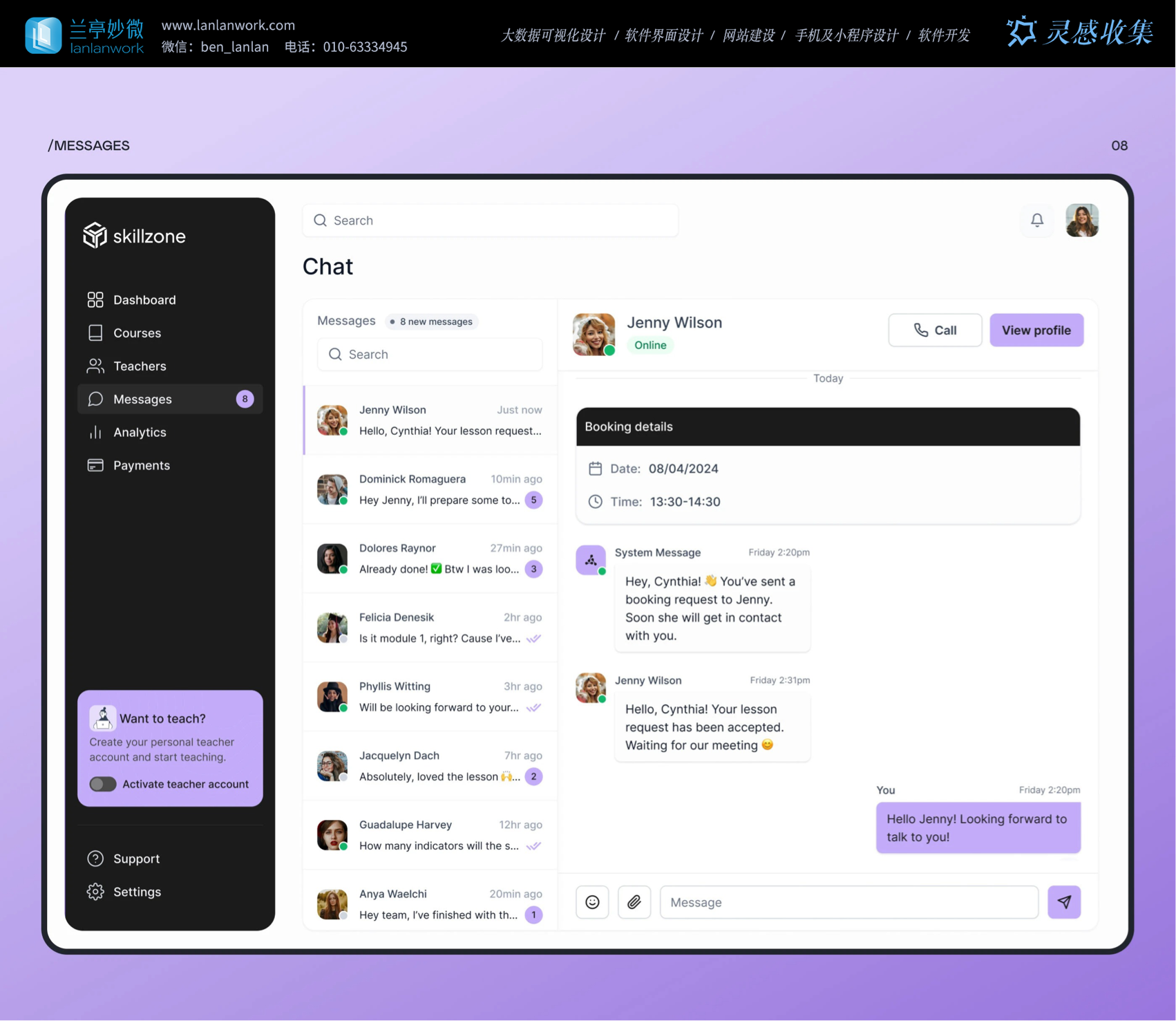 足多樣教學(xué)需求。消息模塊里,聊天界面實(shí)時(shí)顯示在線狀態(tài)、課程預(yù)約詳情,師生溝通方便又順暢。這些貼心設(shè)