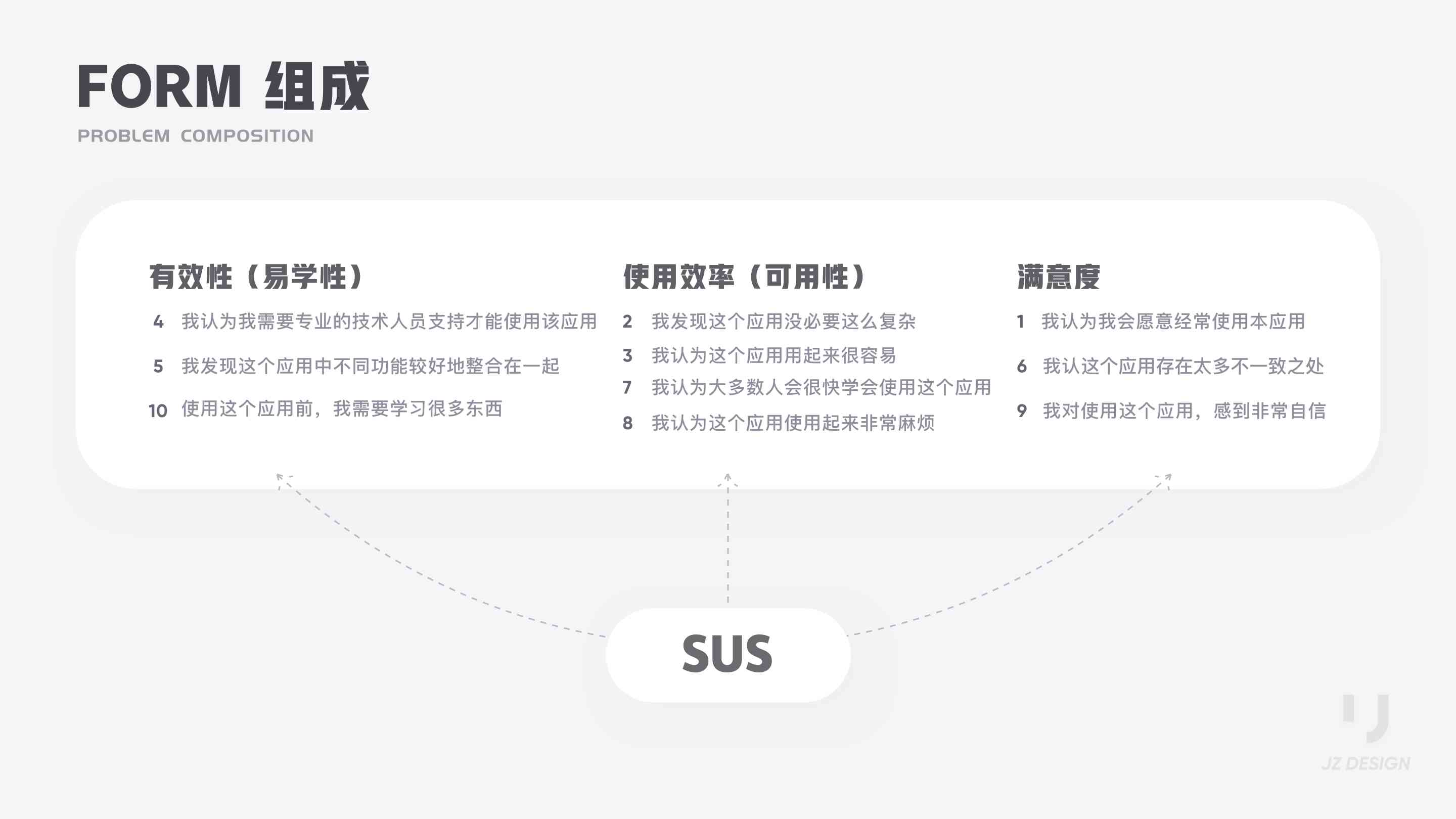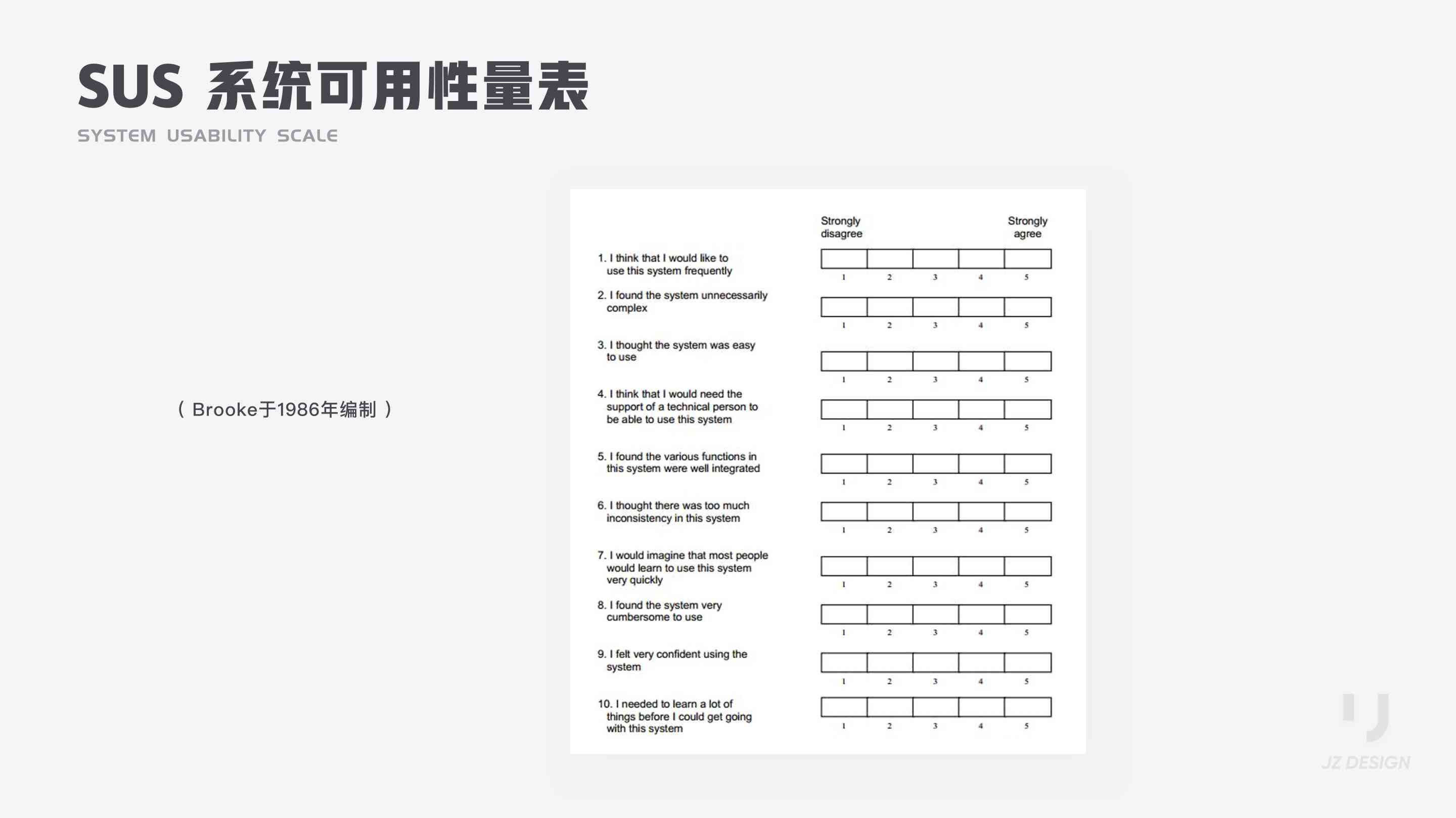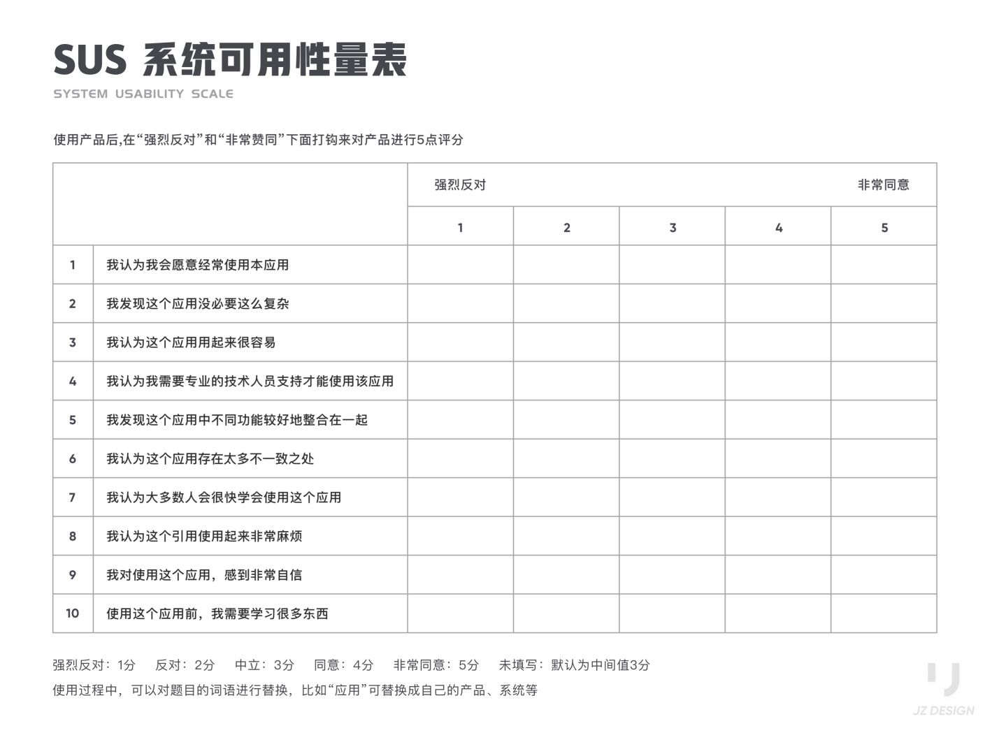 SUS 全稱 System Usability Scale ,系統(tǒng)可用性量表。SUS最初是Brooke于1986年編制,可以科學(xué)地量化用戶體驗,用于完成一系列任務(wù)場景后,對產(chǎn)品或系統(tǒng)整體宏觀的感知可用性測量。