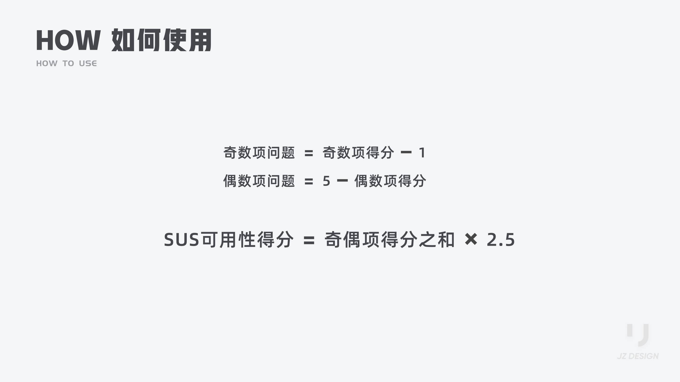 3. 將所有問題最后的得分加在一起,然后乘以2.5;(每個題目的得分范圍記為0~4,最大值為40,SUS可用性得分的范圍在0~100,換算后乘以2.5)