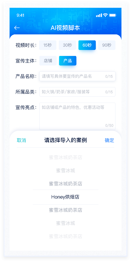 AI生成視頻腳本是用戶輸入相應(yīng)條件后,AI大模型通過(guò)系統(tǒng)算法生成視頻內(nèi)容。整體風(fēng)格較為科技感,因此在配色上使用藍(lán)色漸變及較重投影,符合產(chǎn)品屬性,能夠突出產(chǎn)品的創(chuàng)新性和先進(jìn)性。使用戶在使用過(guò)程中感受到強(qiáng)烈的視覺沖擊和沉浸感,這種體驗(yàn)有助于增強(qiáng)用戶對(duì)產(chǎn)品的興趣。