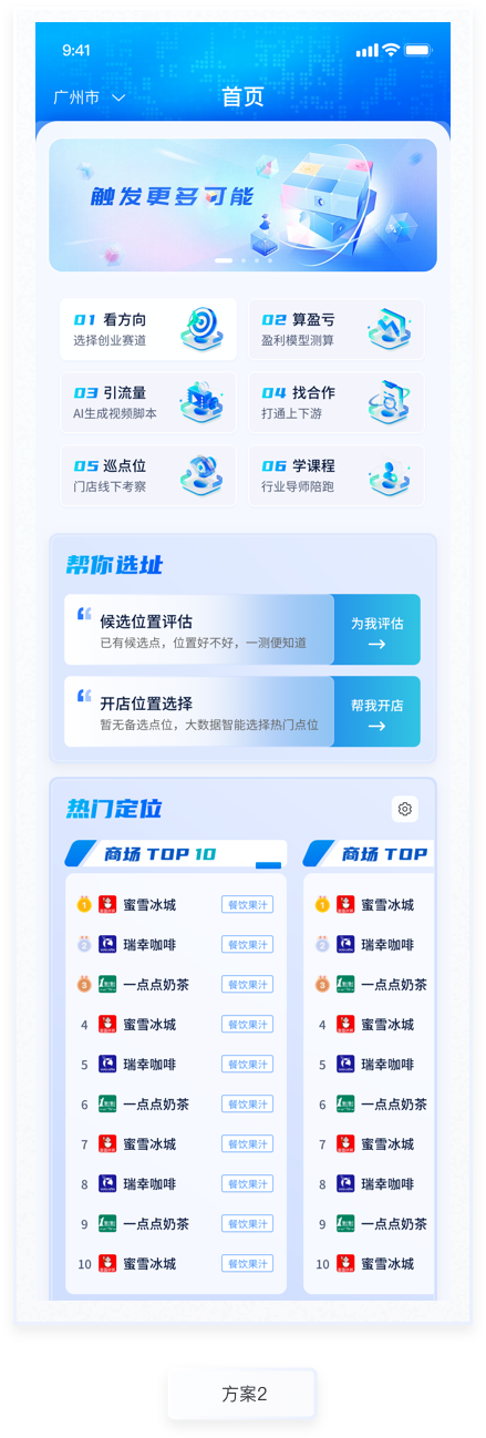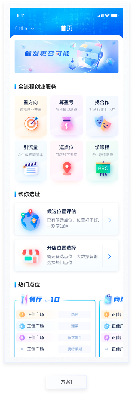 所盈利測(cè)算功能是產(chǎn)品的主要功能,通過(guò)AI對(duì)未來(lái)開店盈虧情況進(jìn)行預(yù)測(cè)評(píng)估。本次設(shè)計(jì)主要優(yōu)化該流程的交互及視覺表現(xiàn),整個(gè)流程分為“成本結(jié)構(gòu)”“收入結(jié)構(gòu)”“經(jīng)營(yíng)測(cè)算”三個(gè)階段,過(guò)程填寫情況放置在頁(yè)面頂部,一步了然。已填寫使用主題色標(biāo)注,未填寫則使用置灰顏色處理,符合用戶基本感知。按鈕使用與主色相近的漸變色。