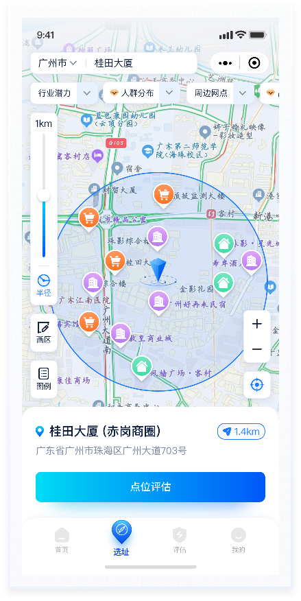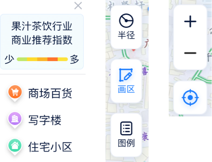 按鈕換膚在地圖上,“半徑”“選區(qū)”便于用戶對(duì)開店范圍的選擇,“圖例”則更側(cè)重圖標(biāo)說(shuō)明性?!胺糯蟆薄翱s小”“定位”則是對(duì)顯示內(nèi)容的操作。