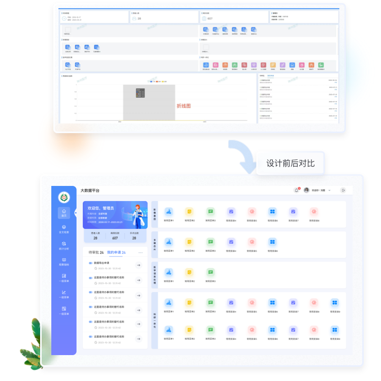 核心數(shù)據(jù)突出顯示-原來首頁沒有登錄人員信息,并且 [患者人數(shù)]、T病例份數(shù)]、手術(shù)臺數(shù),等數(shù)據(jù)每個占據(jù)一個大框顯示頁面顯得空洞,通過整合增加登錄人員信息以及歡迎語,使整個頁面更有親和力,一些相關(guān)數(shù)據(jù)采用卡片疊加的形式展示,不能可以增加整個頁面的靈動感,并且把登錄人員的相關(guān)信息緊密關(guān)聯(lián)起來