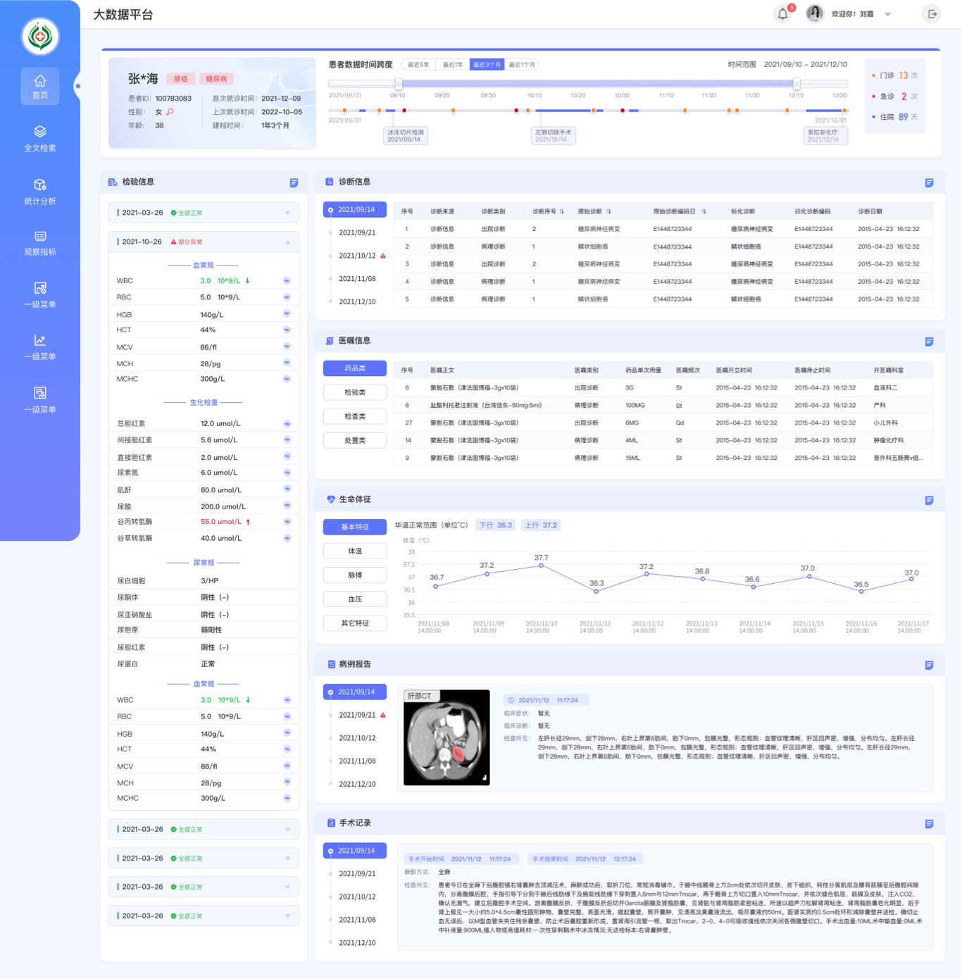 設(shè)計前期,藍藍設(shè)計在和客戶溝通時,客戶提出軟件目前交互體驗不友好,界面上沒有醫(yī)療相關(guān)元素,不能直觀的體現(xiàn)出醫(yī)療軟件等目前存在的問題,希望有使用更方便的交互設(shè)計方式,使軟件全新改觀。在設(shè)計過程中我們參考了國內(nèi)外相關(guān)界面設(shè)計,用心理解業(yè)務,注重“顯而易懂”用戶體驗,操作簡易、流程簡便和患者舒心,并根據(jù)設(shè)計師的理解增加了一部分全局性的統(tǒng)計分析。