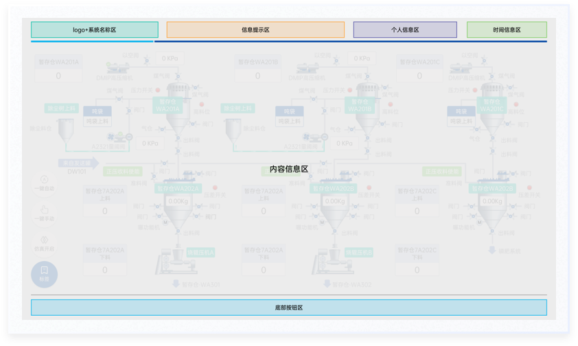 依據(jù)行業(yè)屬性和交互方式,使用環(huán)境的分析結(jié)果,對界面區(qū)域進(jìn)行了相應(yīng)的劃分,通過區(qū)域的大小和顏色區(qū)分信息的重要程度,主要信息+輔助信息,以結(jié)構(gòu)化的方式像用戶輸出多維信息,讓用戶直觀全面獲取信息,為決策和操作提供依據(jù)。