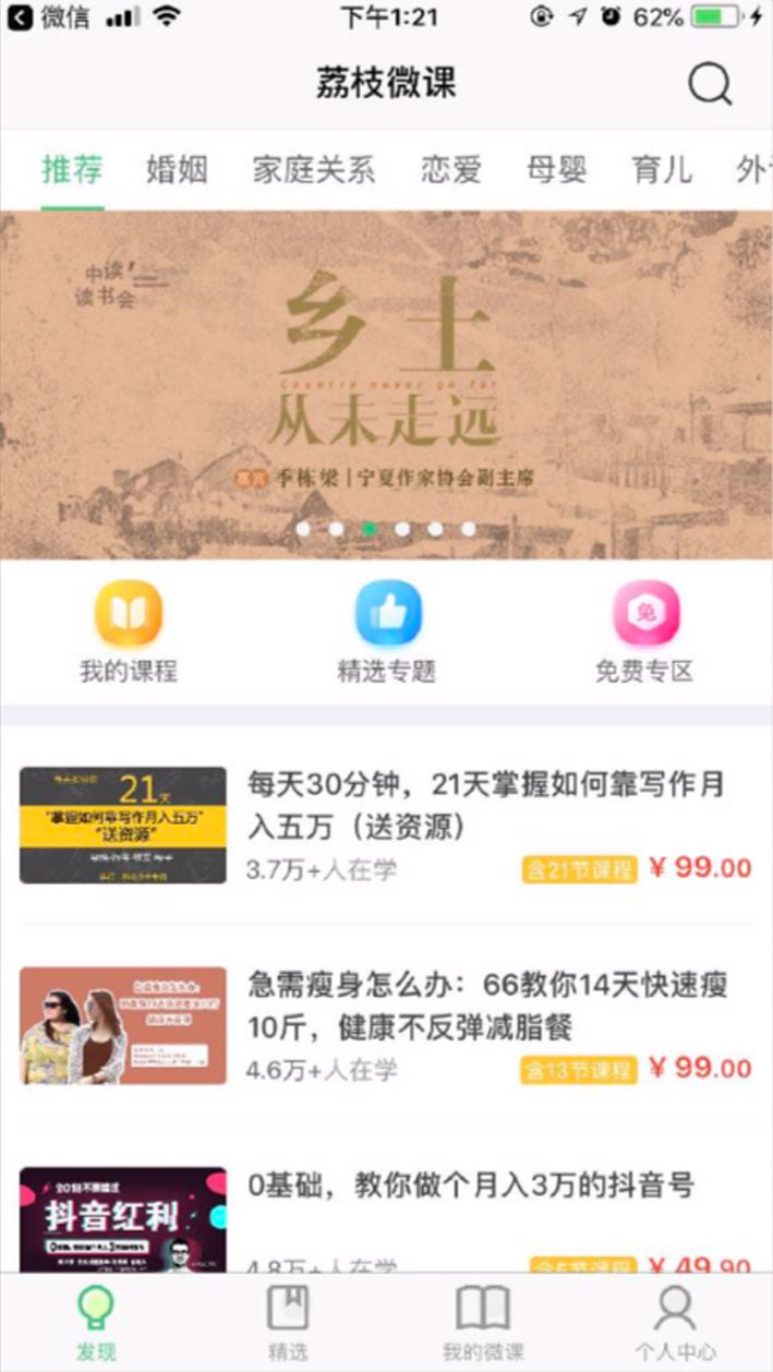 3.中間以三個(gè)圖標(biāo)按鈕表示我的課程,精選專題,免費(fèi)專區(qū)快捷入口方便用戶來回 切換;